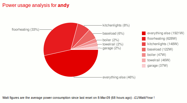 I also calculate the "average wattage" (the numbers in brackets on the chart legend). This is the KWH for that appliance divided by the number of hours we've been running (also held on a retained topic). The best way to think about this number is: if it was an appliance that was always on, this is how much power it would be using; whereas in fact, it's a higher powered device but only on some of the time. Using the "£1/Watt/Year" rule of thumb, this number shows how many pounds a year that appliance costs to run.